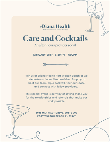 Please Join us at Diana Health as we celebrate our incredible providers. Stop by to meet our team, sip a cocktail, tour our space, and connect with fellow providers.