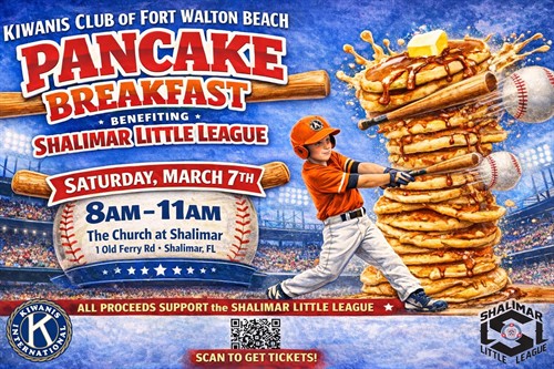 Join us for the Kiwanis Annual Pancake Breakfast benefiting the Shalimar Little League. Enjoy pancakes, sausage, juice, and coffee served by Little League players. The Shalimar Little League supports boys and girls from Shalimar, Mary Esther, Fort Walton, Eglin, and surrounding communities. We will also have a silent auction the morning of the breakfast.