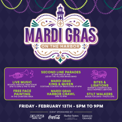 Come enjoy the music, the food, and the unforgettable Mardi Gras spirit - HarborWalk Village style.