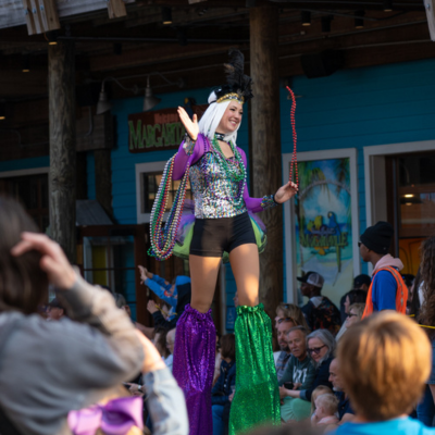 Cap off the night with a spectacular fireworks display over the Destin Harbor, lighting up the sky in true Mardi Gras style. Immediately following fireworks, head to the main stage for a jaw-dropping fire spinning performance by Autumn Lyfe, bringing the celebration to an unforgettable close.