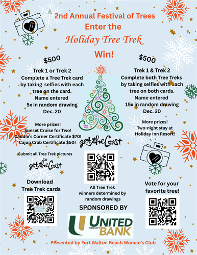 Residents are invited to tour participating locations and enjoy the creatively decorated trees or follow the Holiday Tree Trek Cards taking selfies with the listed trees, and submitting the selfies through GetTheCoast.com for a chance to win prizes in random drawings on December 20-- a $500 grand prize, donated by United Fidelity Bank, a two-night stay at the Holiday Inn Resort on the Island, two $100 prizes, donated by club members Kathy Baird and Vivian Green, a $75 gift certificate from Caddies Corner, a $50 gift certificate from Cajun Crab,  and gift coupons from Florida Place Food Trucks and Rockn' Taco.