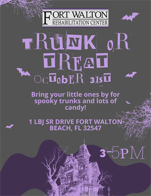 Join us for a family-friendly afternoon/evening of Halloween fun at our TRUNK or TREAT! Our Staff and residents are eager to hand out candy to trick-or-treaters in a safe, festive environment. Dress in your favorite costume and enjoy decorated trunks, treats, and lots of spooky fun for all ages.